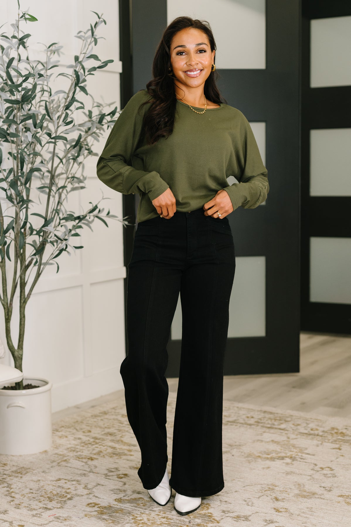 The Dinner Plans Dolman Long Sleeve is your ticket to effortless elegance with a playful edge. Crafted from lightweight jersey knit, it drapes beautifully without weighing you down. Dolman sleeves with exaggerated cuffs create a dramatic silhouette that's equal parts chic and fun, while the round neckline keeps things approachable. A back center seam adds subtle structure to the relaxed fit. Dress it up or keep it casual—this top does it all.