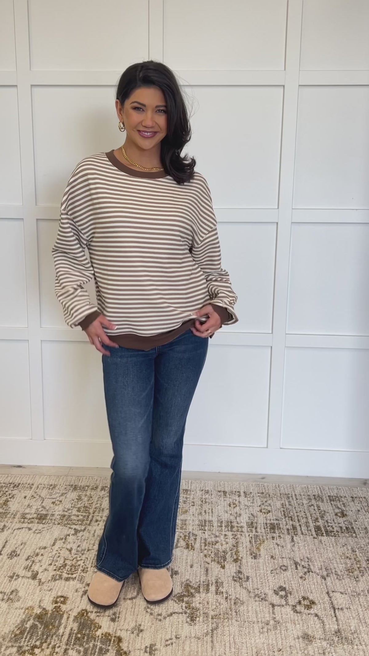 Get ready to rock your wardrobe with our Too Good to Be True Striped Drop Shoulder Top in Brown! This midweight knit top features a banded ribbed neckline, drop shoulder design, and banded ribbed cuffs and hemline for a comfy and stylish fit. Embrace the bold stripes and feel too good to be true!
