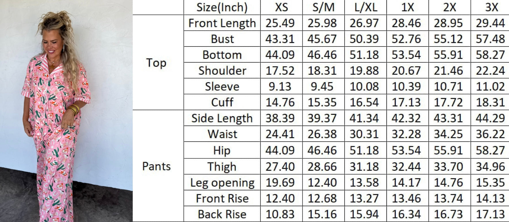 Our Luxe PJ Lounge sets are the perfect sleep set for both comfort and style. Features a button-up top with short sleeves and matching PANTS, with cute new designs that will keep you looking good while you relax. The fabric is ultra-soft, STRETCHY and lightweight for a relaxed feel. Pants have pockets and elastic waist. Feature contrast fabric on trim and collar for an extra "luxe" feel.